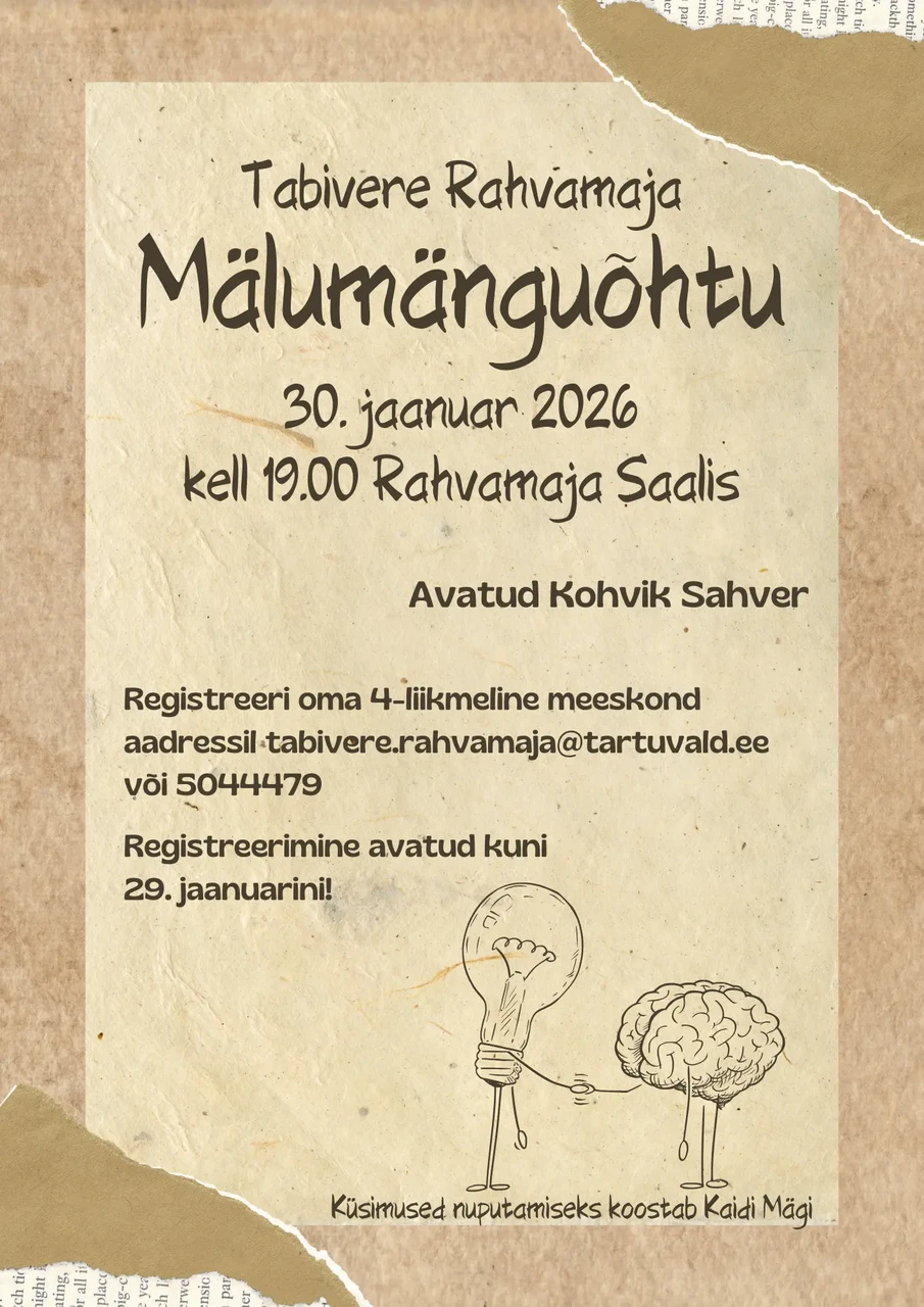 30. jaanuar kell 19.00 Mälumänguõhtu rahvamaja saalis